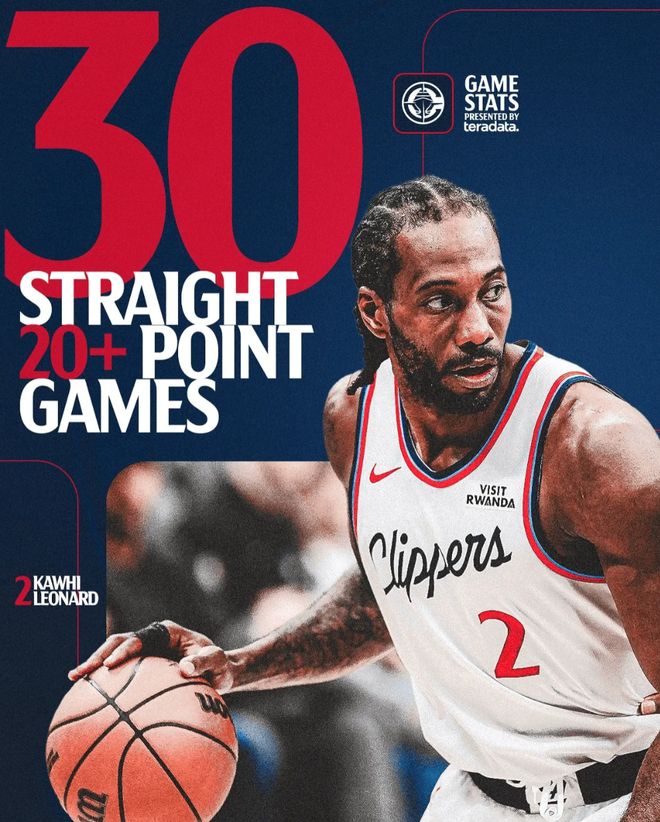 2.小卡连续30场20+在快船队史超过格里芬;