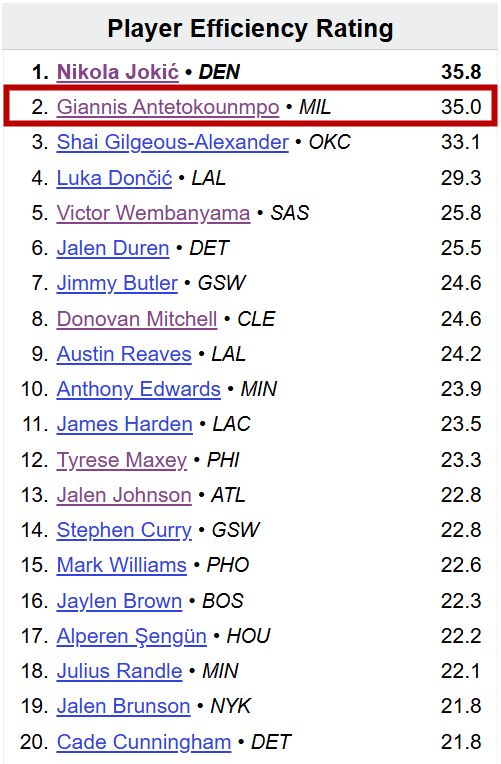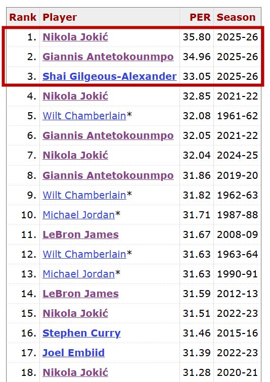 多说一句,本赛季的PER值榜又出现了神仙打架,约基奇、字母哥、亚历山大不仅仅是这个赛季的前三,而且还暂时是NBA历史单赛季的前三,此前的历史第一是约基奇2021-22赛季创造的32.85。