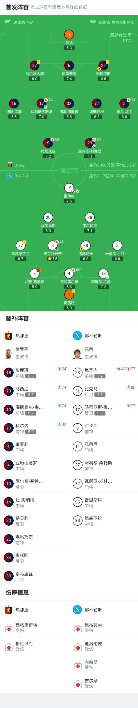 北京时间2月8日意大利足球顶级联赛 联赛 第24轮,热那亚主场对阵那不勒斯。上半场,梅雷特送点,马利诺夫斯基主罚命中。麦克托米奈射门被扑出,霍伊伦扳平比分。随后,麦克托米奈轰入世界波。下半场,布翁焦尔诺后场玩火被断,科隆博扳平比分。胡安-热苏斯犯规,被主裁出示第二张黄牌罚下。补时阶段,韦尔加拉造点,霍伊伦一蹴而就完成绝杀。全场比赛结束,十人那不勒斯3-2战胜热那亚。