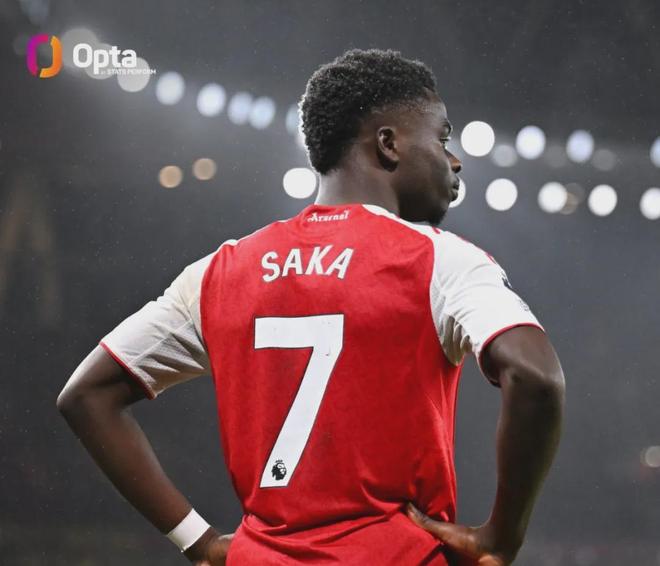 Opta统计,萨卡已经在英超直接参与105球(57球48助攻),是25岁之前阿森纳队史参与英超进球数并列最多的球员,和法布雷加斯持平。